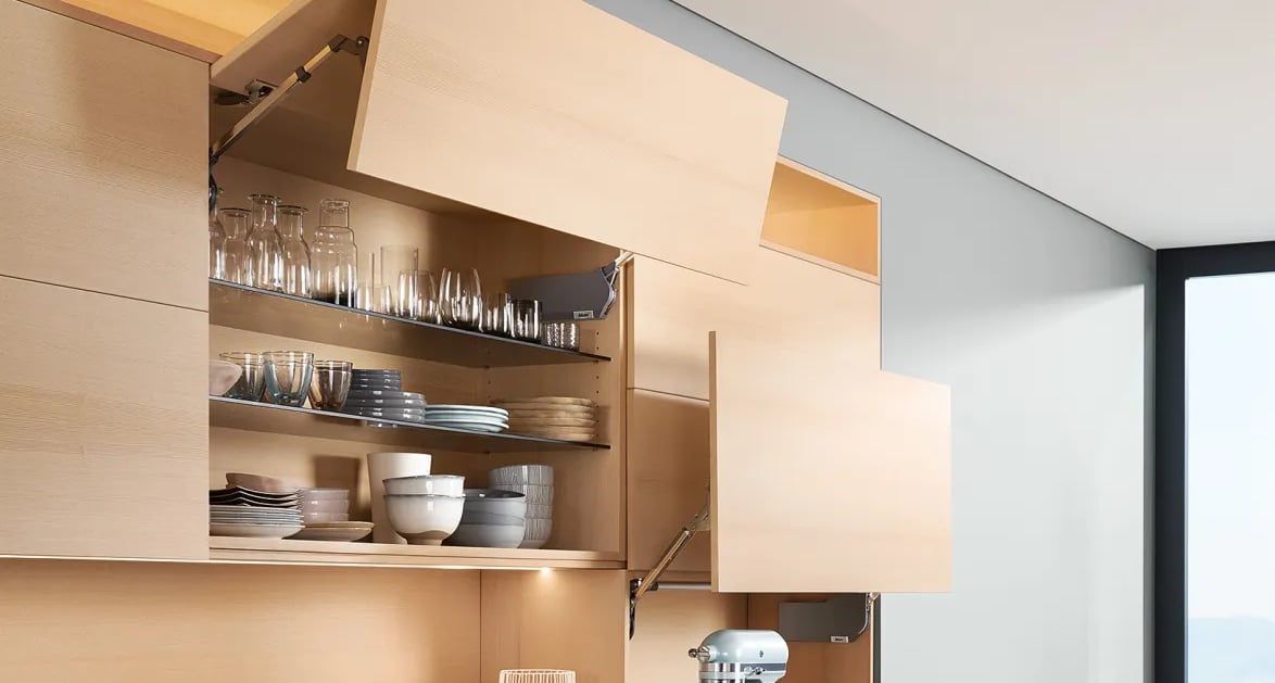 6. Servo-Technik: Oberschränke können wir auch mit Servotechnik ausstatten, die das Öffnen und Schließen der Türen automatisieren. Durch eine leichte Berührung oder einen Knopfdruck öffnen sich die Türen automatisch, was besonders praktisch ist, wenn man keine Hand frei hat.