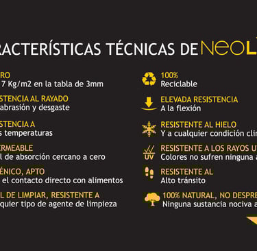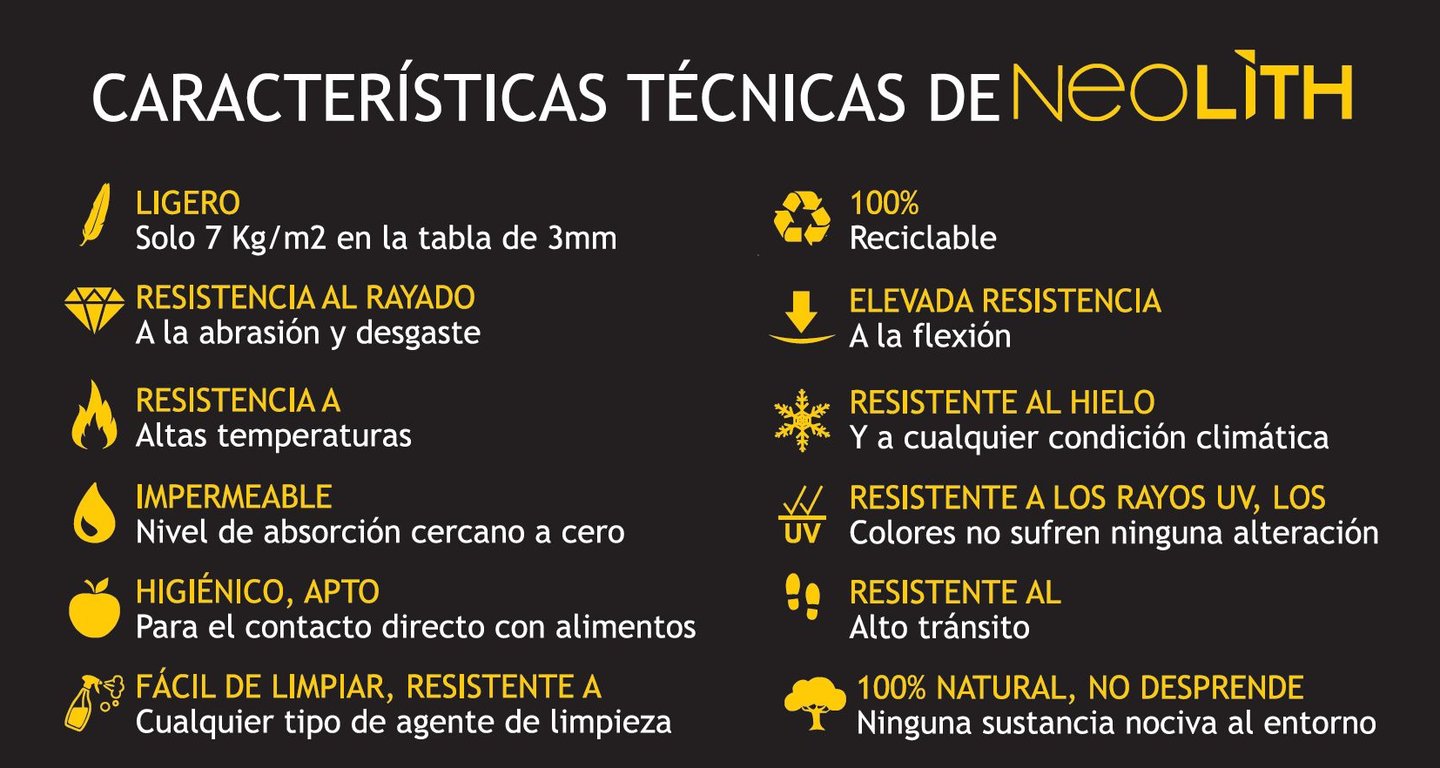Das Material ist äußerst biegefest und widersteht hohen Druck- und Gewichtslasten. Zudem ist Neolith® nahezu vollständig wasserundurchlässig, brennt nicht bei Kontakt mit Feuer und setzt weder Rauch noch giftige Stoffe frei. Es enthält keine schädlichen Substanzen und ist daher vollständig für den Kontakt mit Lebensmitteln geeignet.
