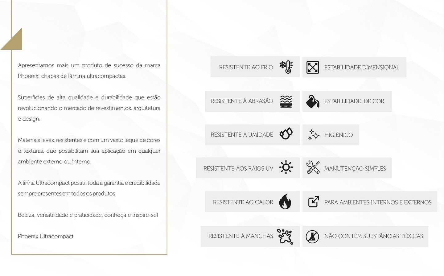 Das Material ist biegefest und widersteht hohen Druck- und Gewichtslasten. Ultracompact® ist nahezu vollständig wasserundurchlässig und brennt nicht bei Kontakt mit Feuer, noch setzt es Rauch oder giftige Stoffe frei. Es enthält keine schädlichen Substanzen und ist daher vollständig für den Kontakt mit Lebensmitteln geeignet.