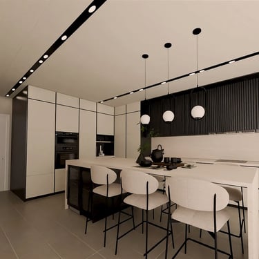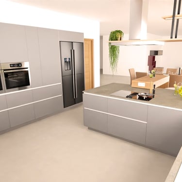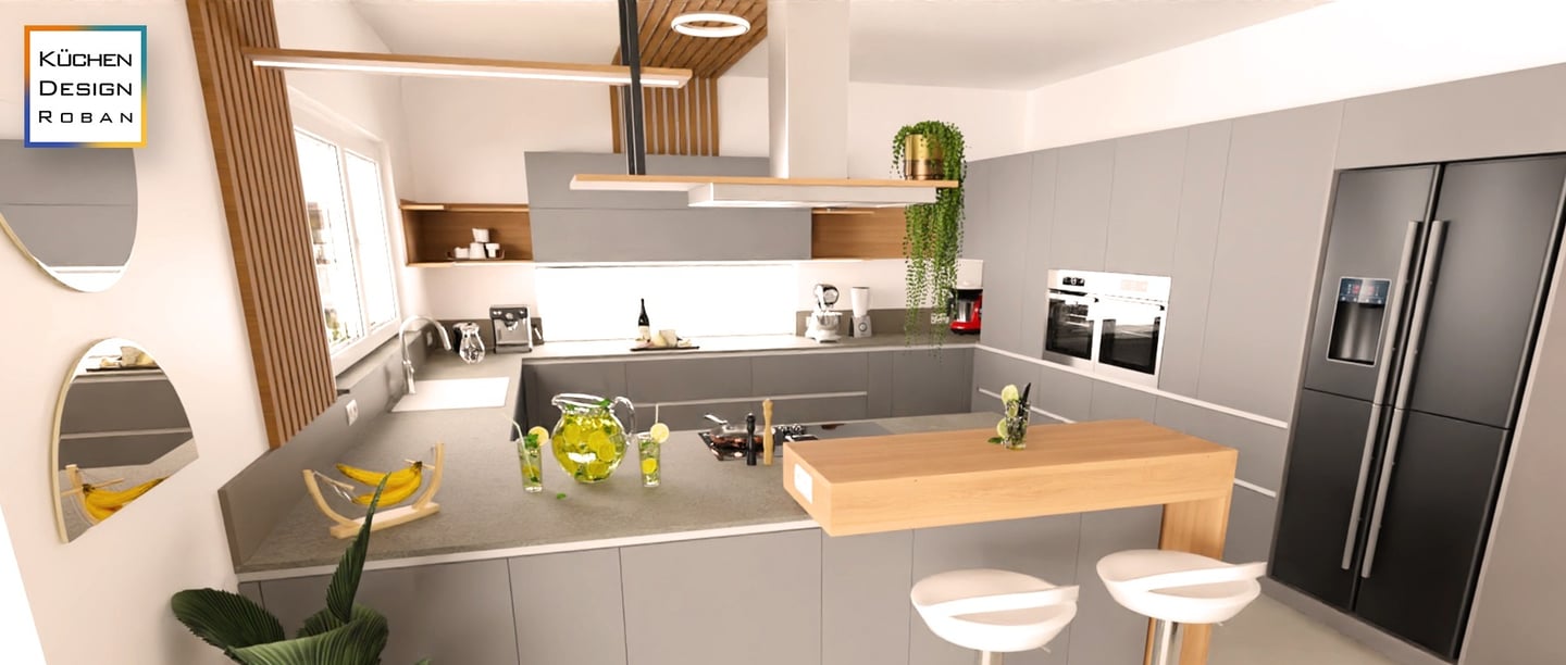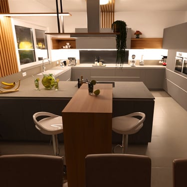 Die Küche besticht durch ihr modernes und minimalistisches Design. Die glatten, grifflosen Fronten in mattem Hell-Grau harmonieren perfekt mit der Arbeitsplatte. Gerade diese Kombination aus verschiedenen Mitteltönen schaffen ein elegantes Ambiente. Ein Holzakzent im Barbereich sorgt für Wärme und Natürlichkeit. Die gut platzierte Beleuchtung setzt die klaren Linien und die hochwertige Ausstattung, inklusive der eingebauten Elektrogeräte und dem großen, schwarzen Kühlschrank, in Szene.