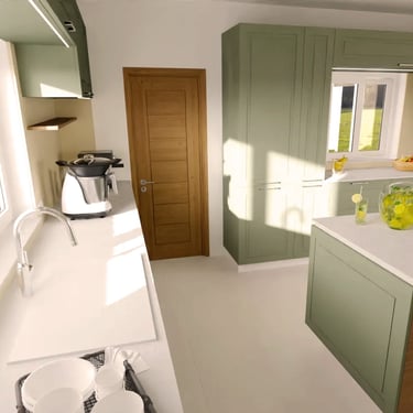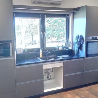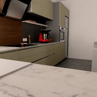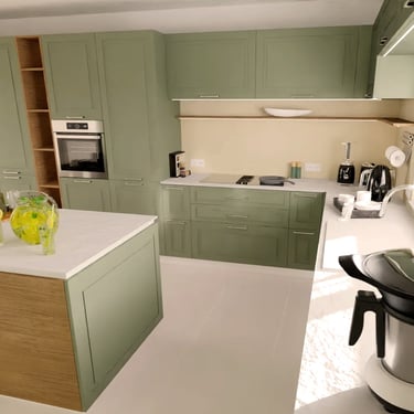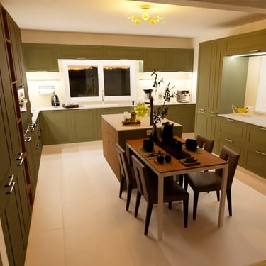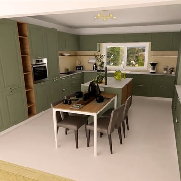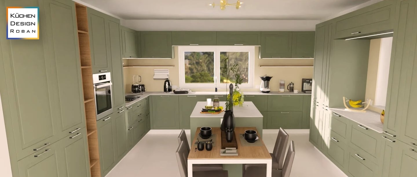 Diese moderne Küche zeichnet sich durch ein elegantes Design aus. Die Fronten der Küchenschränke sind in einem stilvollem, matten Grünton lackiert, der einen harmonischen und beruhigenden Eindruck vermittelt. Die Schränke sind mit schlanken, silbernen Griffen ausgestattet, die einen Hauch von Funktionalität hinzufügen.