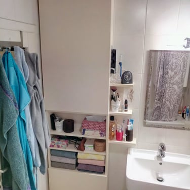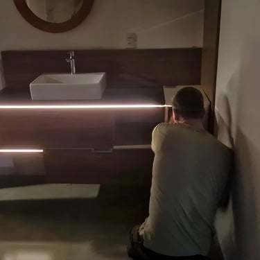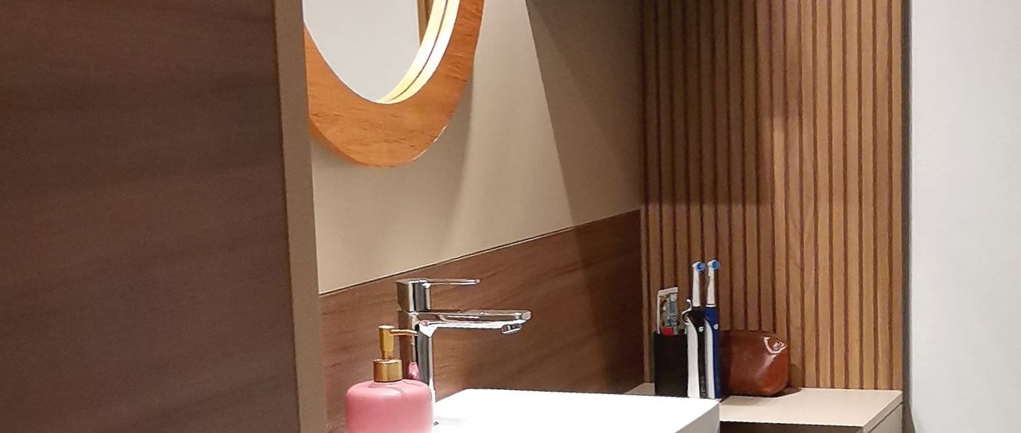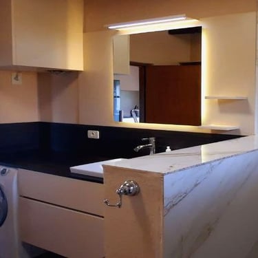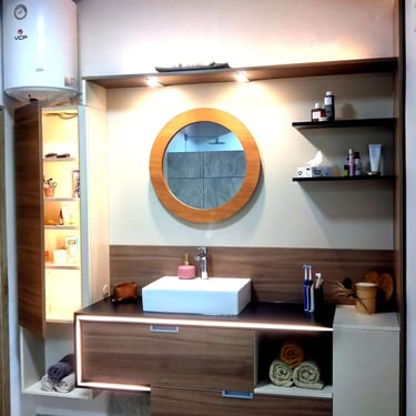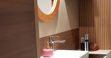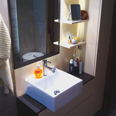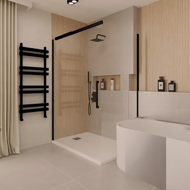 Diese harmonische Komposition, die aufeinander abgestimmten Farben sowie die Beleuchtung, verwandeln das Badezimmer in eine einladende und beruhigende Wohlfühloase, die zum Entspannen einlädt.