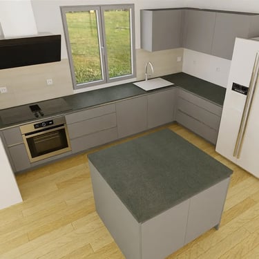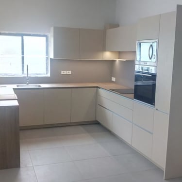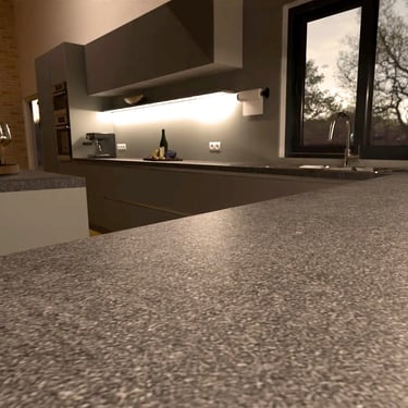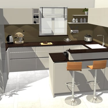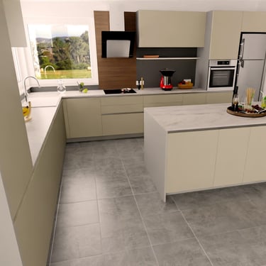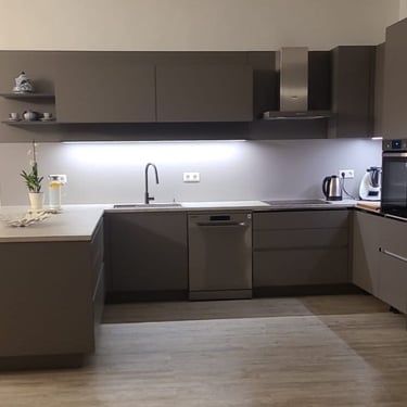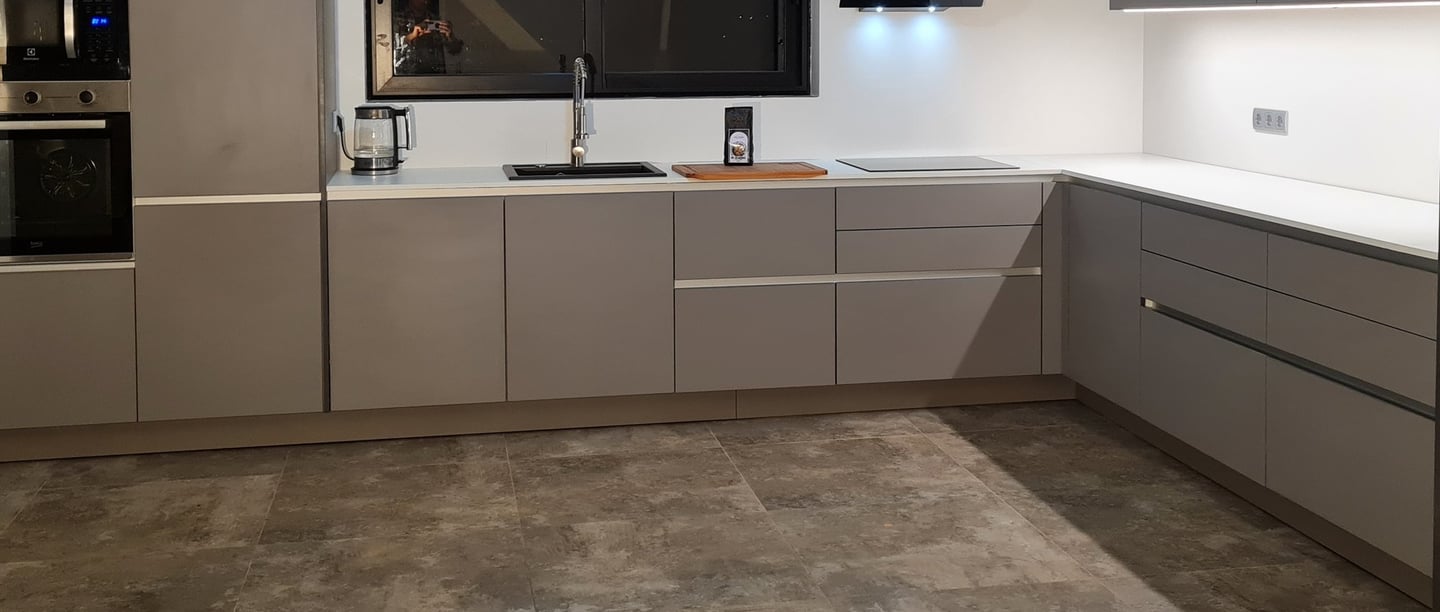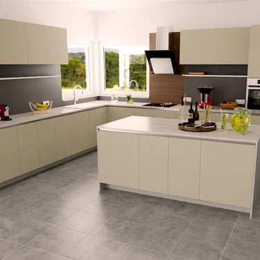 Hier wurden drei elegante Farben kombiniert: der Farbton Taupe, Verti und als Arbeitsplatte Murano. Entworfen wurde diese Küche für eine Familie, die einerseits großen Wert auf eine elegante Optik legt und andererseits aufgrund der Kinder im Haushalt auf robuste Materialien setzen muss.