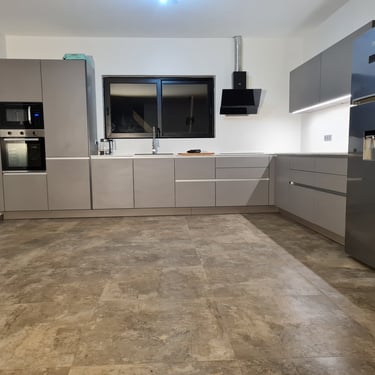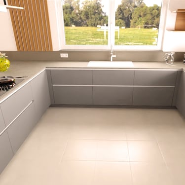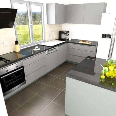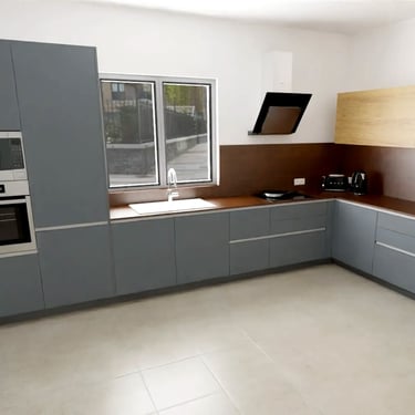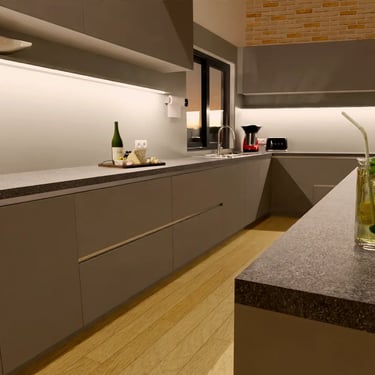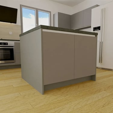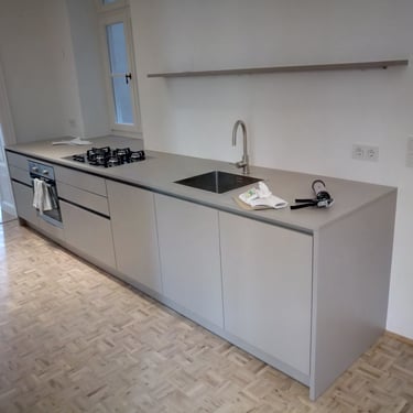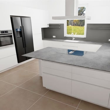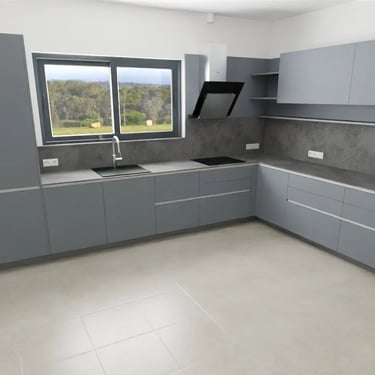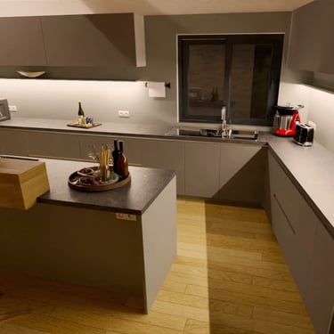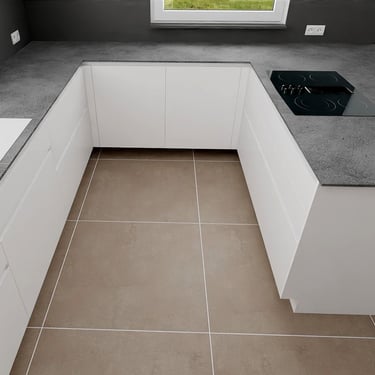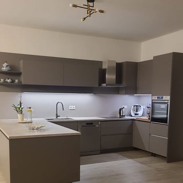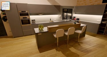Unser edles Designküchenangebot, überzeugt durch Fehgraue Oberflächen, Arbeitsplatten und Sockelblenden sind hier ähnlich gehalten. Die Fronten verleihen ihr eine elegante Anmutung. Das minimalistische Design erzeugt visuelle Harmonie und Noblesse, unterstützt durch zurückhaltende Griffleisten in Aluminiumoptik.