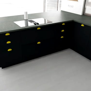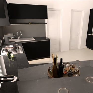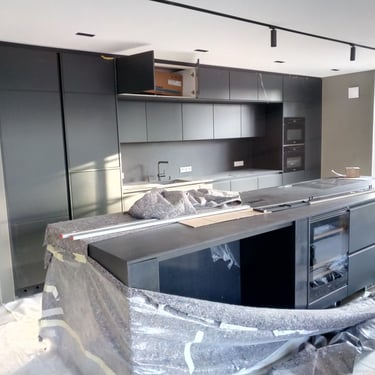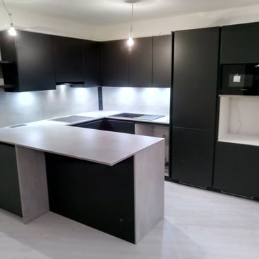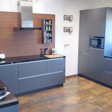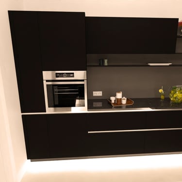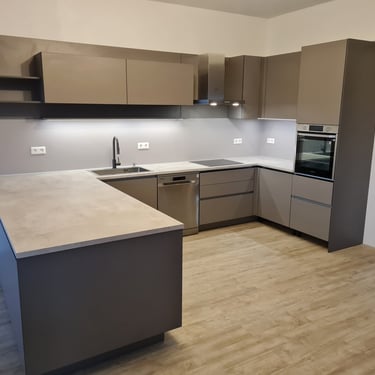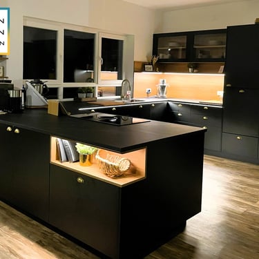 Die Ultracompact-Arbeitsplatte ist sehr robust, wasserresistent und weist eine matte Oberfläche auf, die keine Fingerabdrücke hinterlässt. Die schwarze Glasrückwand sorgt für einen stilvollen Kontrast und verleiht der Küche einen modernen, geradlinigen Look. Insgesamt ergibt sich so eine hochwertige, designorientierte Küche, die sich ideal für Liebhaber klarer Formen und dunkler Farben eignet.