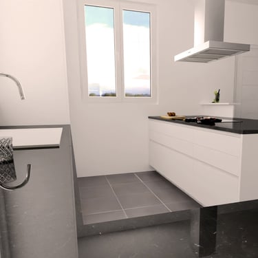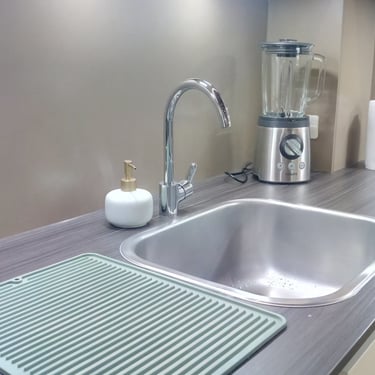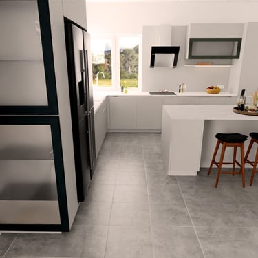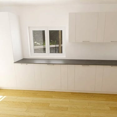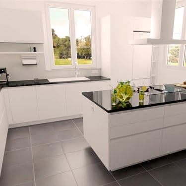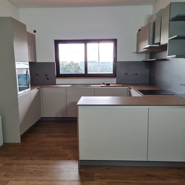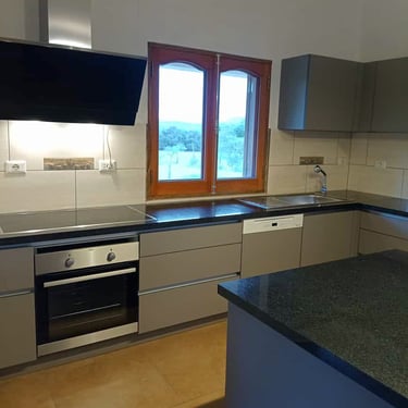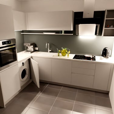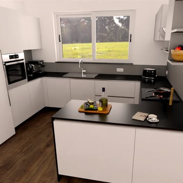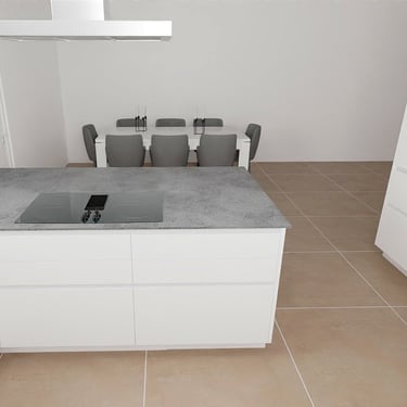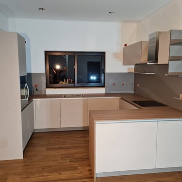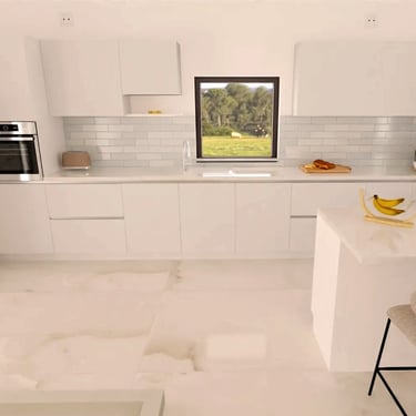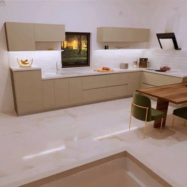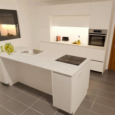Das Herzstück der Küche ist eine großzügige Kücheninsel, die sowohl als Arbeitsfläche als auch als Essbereich dient. Die Neolith Arbeitsplatte ist in Polar-Weiß gehalten, diese ist ästhetisch sehr ansprechend. Ein großes Fenster über der Spüle sorgt für reichlich Tageslicht und bietet einen schönen Blick nach draußen. Die Anordnung der Schränke und Geräte ist ergonomisch optimiert, um ermüdungsfreies Arbeiten zu ermöglichen.