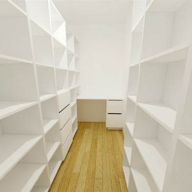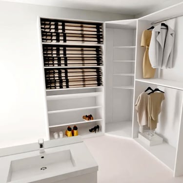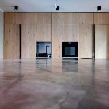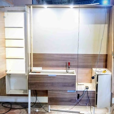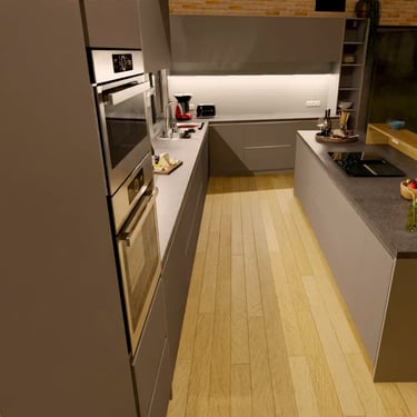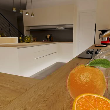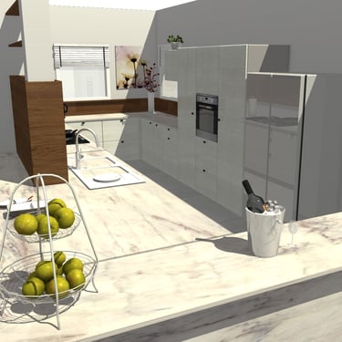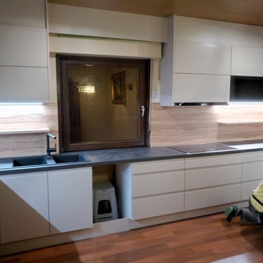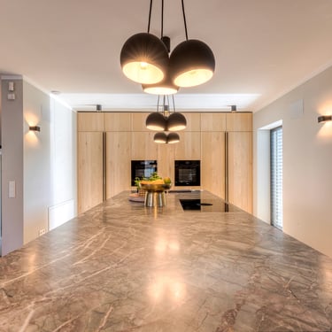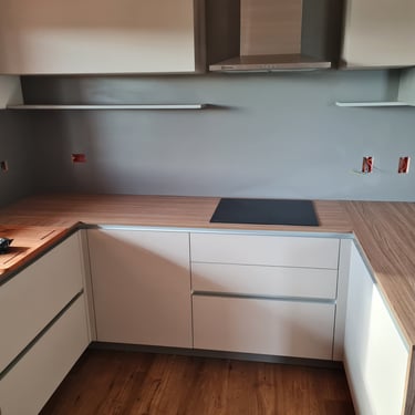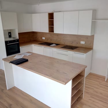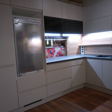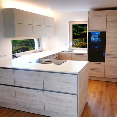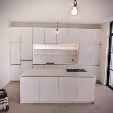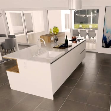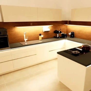 Diesmal sind die Fronten in Matt Weiß gehalten und grifflos, was eine klare und aufgeräumte Optik erzeugt. Eine große Kücheninsel dominiert den Raum, ausgestattet mit einer fast weißen Ultracompact Arbeitsplatte. Die Holzelemente sind mit Innenbeleuchtung ausgestattet und sollen als Blickfang dienen, während sie gleichzeitig einen Kontrast zu den weißen Elementen bilden.