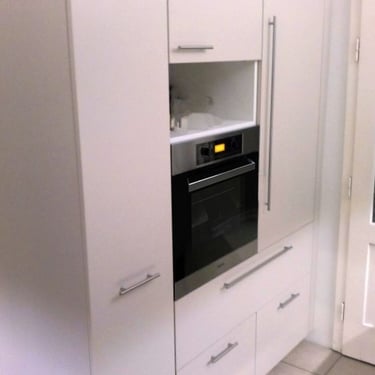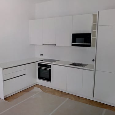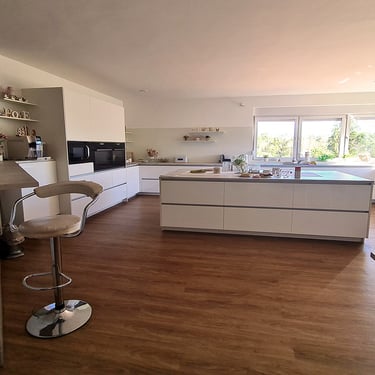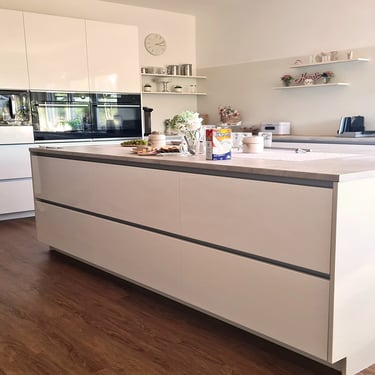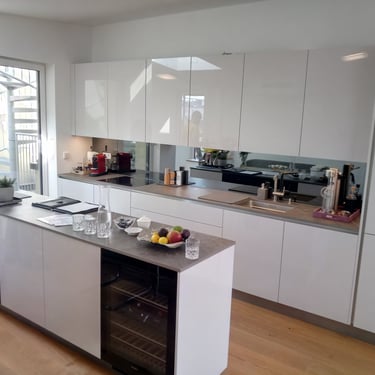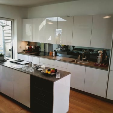 Unsere Designküchen zeichnen sich durch klare Linien, edle Materialien und eine strukturierte Innenarchitektur aus. Mit glatten, schnörkellosen Oberflächen gestalten wir kleine oder große Lifestyle-Küchen nach deinen Vorstellungen. Diese Küche besticht durch ihre schlichte Eleganz in lackiertem Hochglanz Alpin weiß. Das schafft pure Leichtigkeit und unterstreicht den offenen Loftcharakter!