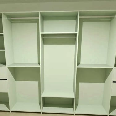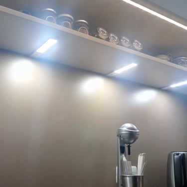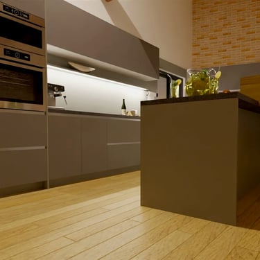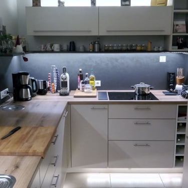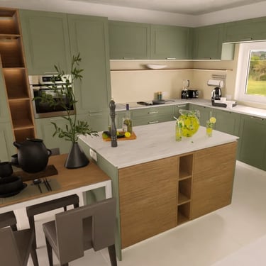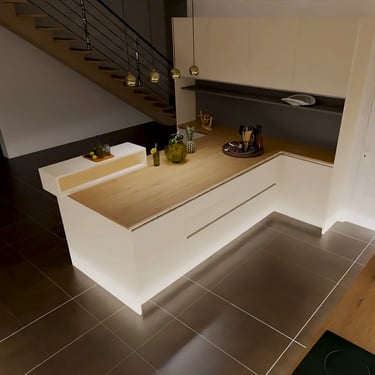 Die Farbpalette der Küche kombiniert sanfte Grüntöne mit warmen Holzelementen in den offenen Regalen, die mit indirektem Licht ausgestattet sind. Dies schafft einen harmonischen Kontrast und verleiht dem Raum eine gemütliche Atmosphäre. Spot-Beleuchtung im Deckenüberbau, eine dimmbare direkte Arbeitsbeleuchtung, das auch für Ambiente am Abend sorgen kann, eine indirekte Beleuchtung unter der Arbeitsplatte als auch im Sockel.