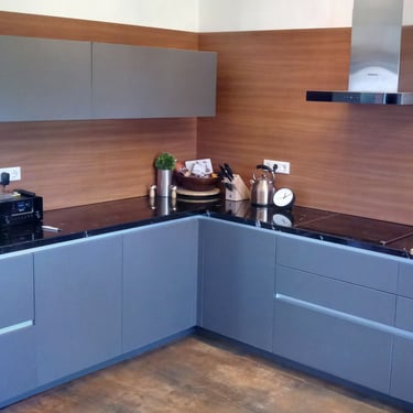 In dieser Küche wurden zwei Modelle kombiniert. Die Arbeitsoberfläche, als auch die Rückwand wurde in einer Kompaktplatte sowohl in rostbraunem Stil, als auch in einer Streifen durchzogenen grauen Kombination präsentiert.