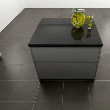 Die anthrazitfarbene Arbeitsplatte setzt einen eleganten Kontrast und bietet reichlich Arbeitsfläche, einschließlich der großen Insel mit integriertem Kochfeld. Der in den Hochschränken integrierte Backofen und der großzügige, schwarze Side-by-Side-Kühlschrank fügen sich nahtlos ein. Dieser wurde extra hochgestellt, um einerseits die Füße zu schonen und andererseits eine bessere Einbauoptik zu erhalten.