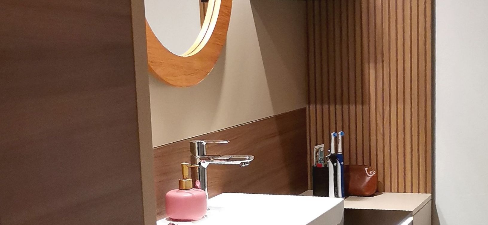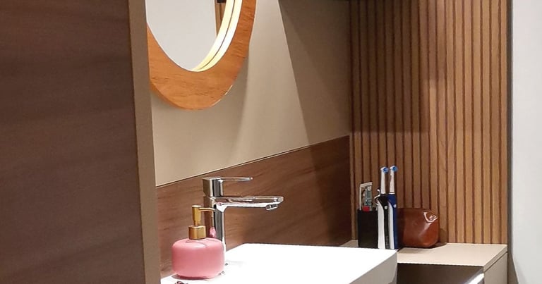 Diese harmonische Komposition, die aufeinander abgestimmten Farben sowie die Beleuchtung, verwandeln das Badezimmer in eine einladende und beruhigende Wohlfühloase, die zum Entspannen einlädt.